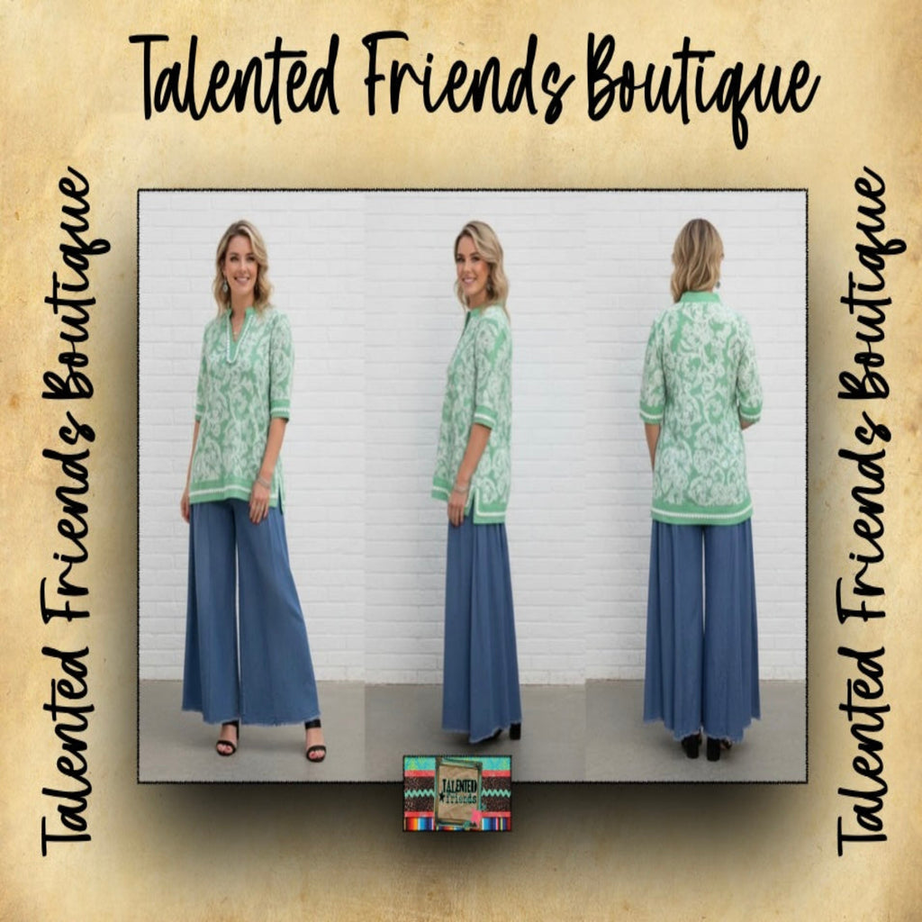 Featuring a mint and green paisley print, short sleeves, and a flattering v-neck