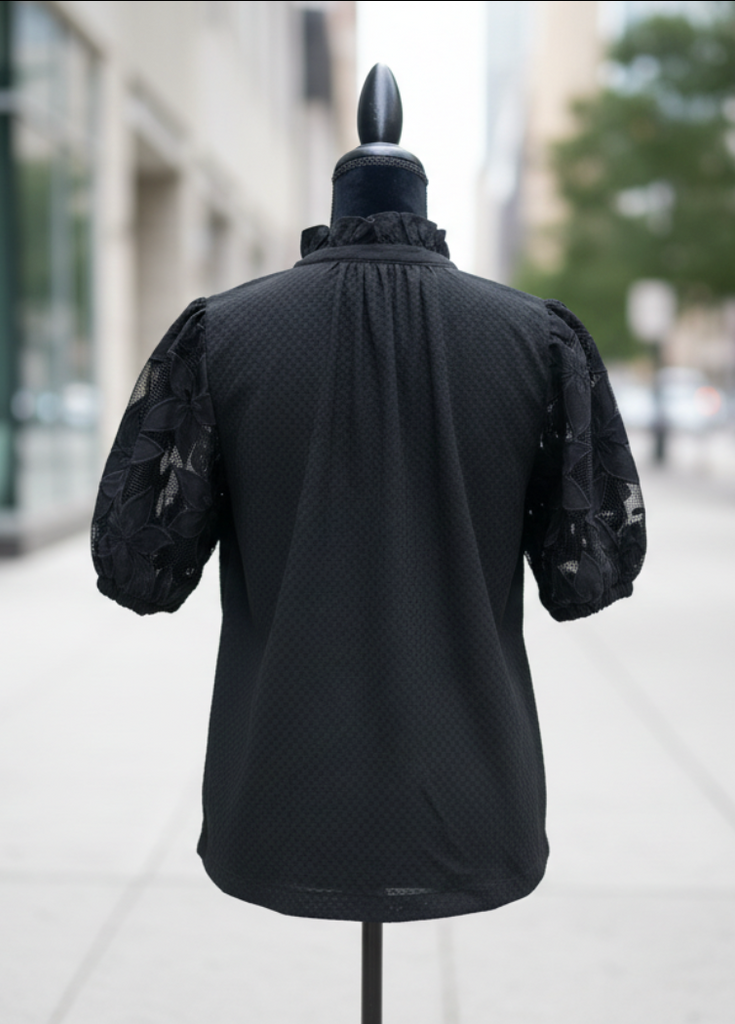 The flattering V-neckline features a delicate ruffle trim that adds a touch of softness, while the lace short puff sleeves deliver instant personality.